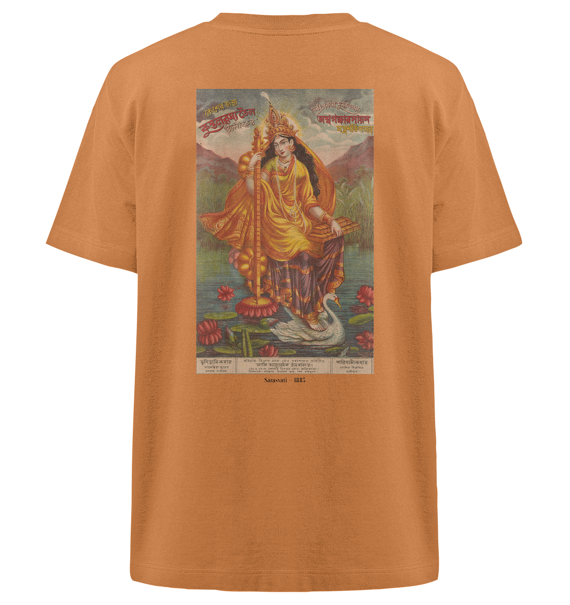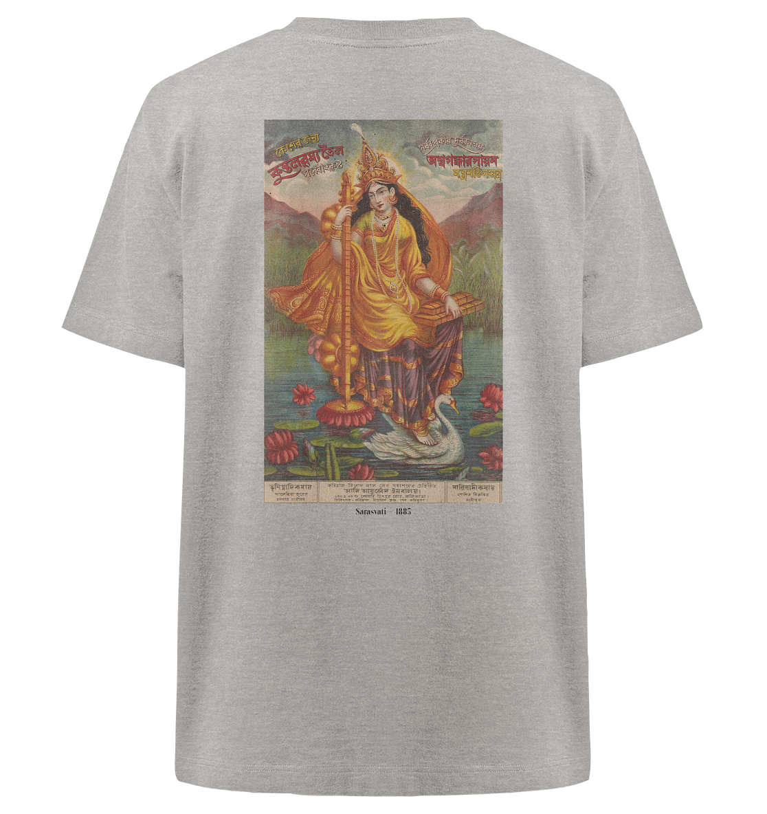 Sarasvati hält eine Vina und einen Stapel Bücher, wie es ihrer Rolle als Göttin der Musik und des Lernens entspricht. Dieses Bild wurde als Werbemittel hergestellt – in diesem Fall für das Ayurveda-Geschäft von Kaviraj Binod Lal Sen, einem Anbieter von Haaröl und Tonika gegen Lethargie und andere Beschwerden.
